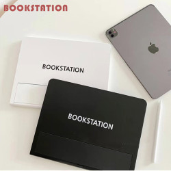Корейский BookStation Чтение компьютера, поддерживающего рамки, студент читает книгу для портативного со складыванием плоский панель Сценарий