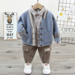 На мальчика свитер комплект детские Осенняя одежда детские демисезонный трикотажный кардиган 3 накладки Детское молодое детство клетчатый одежда