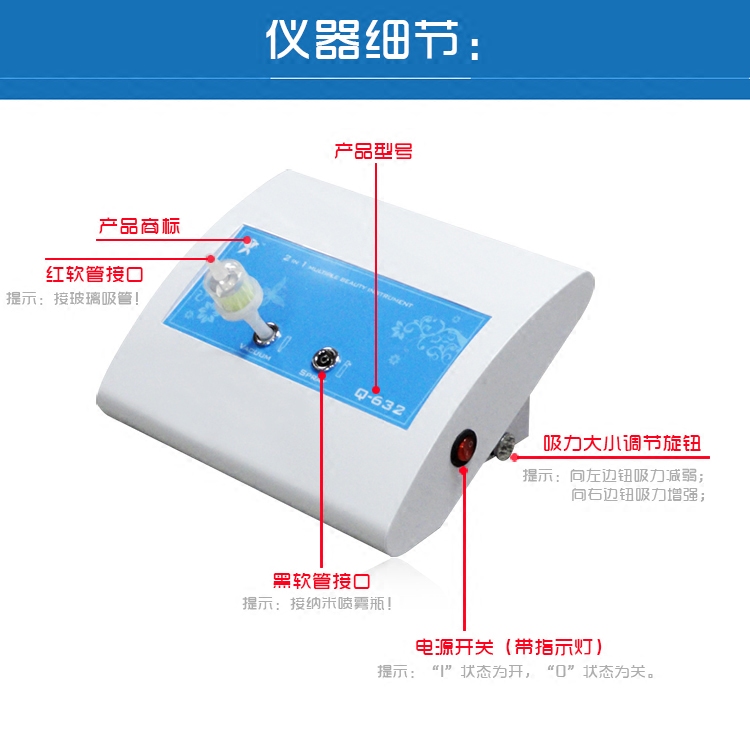 Подсоедините фильтр к машине и красный Подсоедините шланг к фильтру. верх , Другой конец соединен с всасывающим патрубком, и машину можно использовать после запуска машины. Стеклянная соломинка сторона поверхность имеет Это небольшая дырочка, вам, ребята, нужно зажать ее, чтобы пососать. В то же время вы можете отрегулировать кнопки, чтобы контролировать силу.( имеет Можно заменить три разные насадки в зависимости от положения лица.)