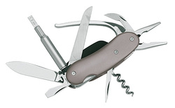 Функция: Палаш, Ножницы ( имеет Малая пилообразная) и панель Запатентованная конструкция пластинчатой пружины, открывалка для бутылок, проволочная крутка, консервный нож, пилка для ногтей, средство для удаления накипи, дрель, зубочистки, пинцет, кольцо для ключей, съемник для шампанского