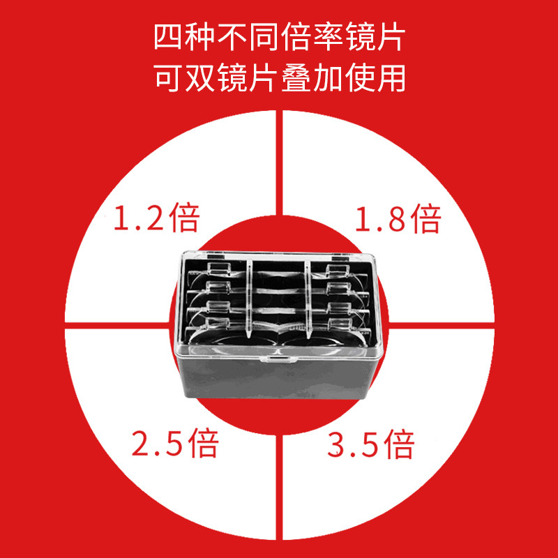 2 имеет поддерживающий зеркало 4 шт(1.2X, 1.8X, 2.5X, 3.5X), При необходимости можно заменить зеркало Части или использование с наложением (до двух наложенных друг на друга)