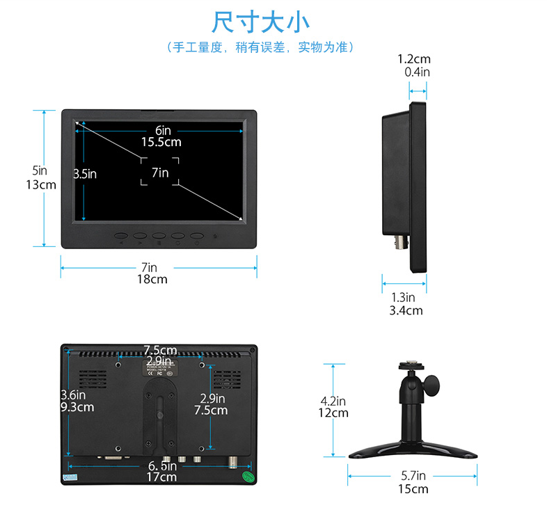- 7-дюймовый IPS-экран USB / AV / VGA / BNC / HDMI