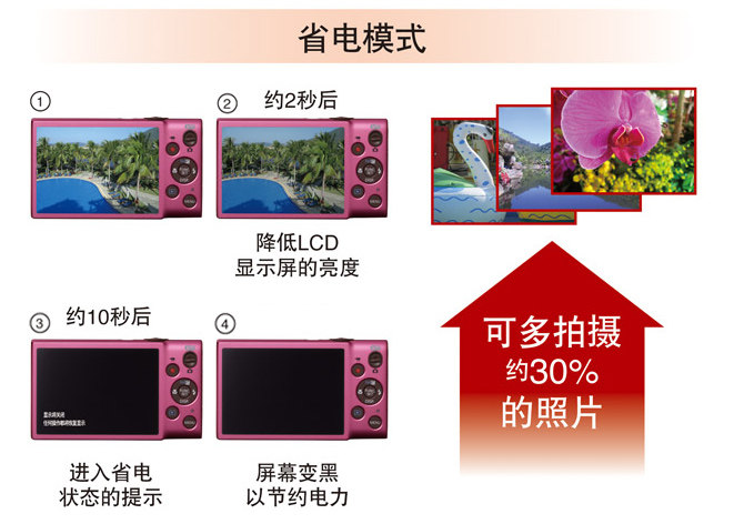 | ◆ ECO模式(Режим энергосбережения) Инструмент имеет полностью новый ЭКО-режим(Режим энергосбережения),在不使用相机约2秒后,屏幕会变暗;再过约10秒后,屏幕会关闭;不操作 | 相机约3分钟后,相机会 автоматическая Выключить.通过使用此模式,可多拍摄约30%的照片,能够为你降低电池消耗,拍得更持久。 |