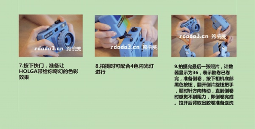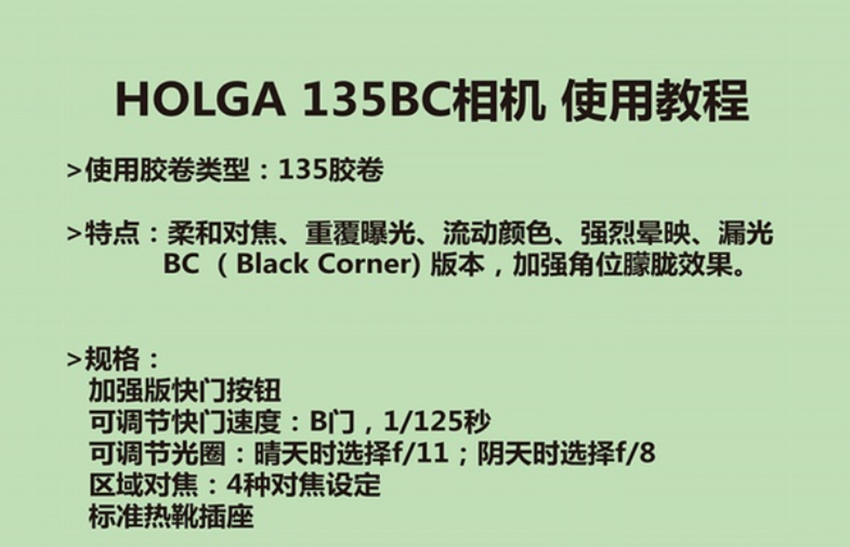 полностью новый Мини версия Использование 35-мм камеры Holga полностью пластик зеркало Глава, обеспечьте два вида поста дверь Режим и две настройки диафрагмы. B быстро дверь Он также позволяет снимать несколько экспозиций на одной и той же сетке негативов, а цвет сделанных фотографий цвет Эффектный, с резким контрастом, излучает оригинал версия - мягкий тон Холги.