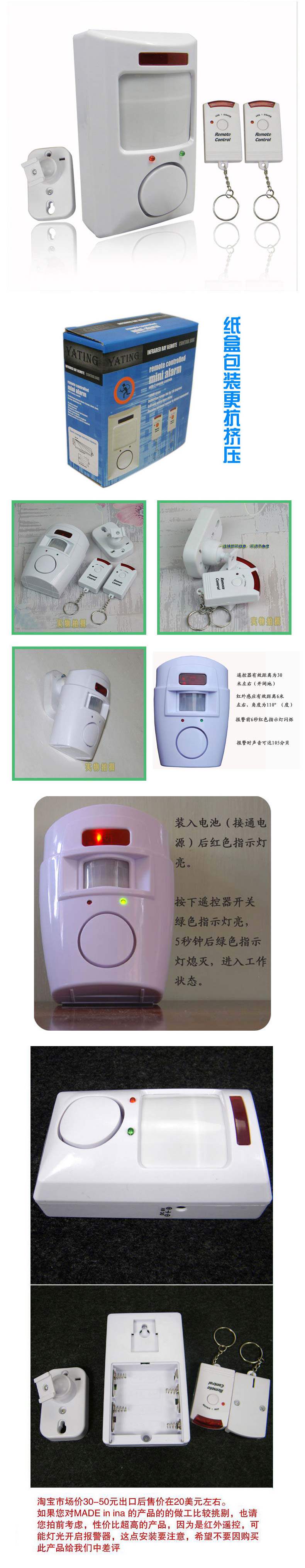 один. Пакет верх Батарея, откройте хост сигнализации с помощью пульта дистанционного управления,зеленый свет Свет около 20 секунд, эти 20 секунд - время задержки для питания,Вы можете уйти за эти 20 секунд красный Район разведки внешней тревоги.