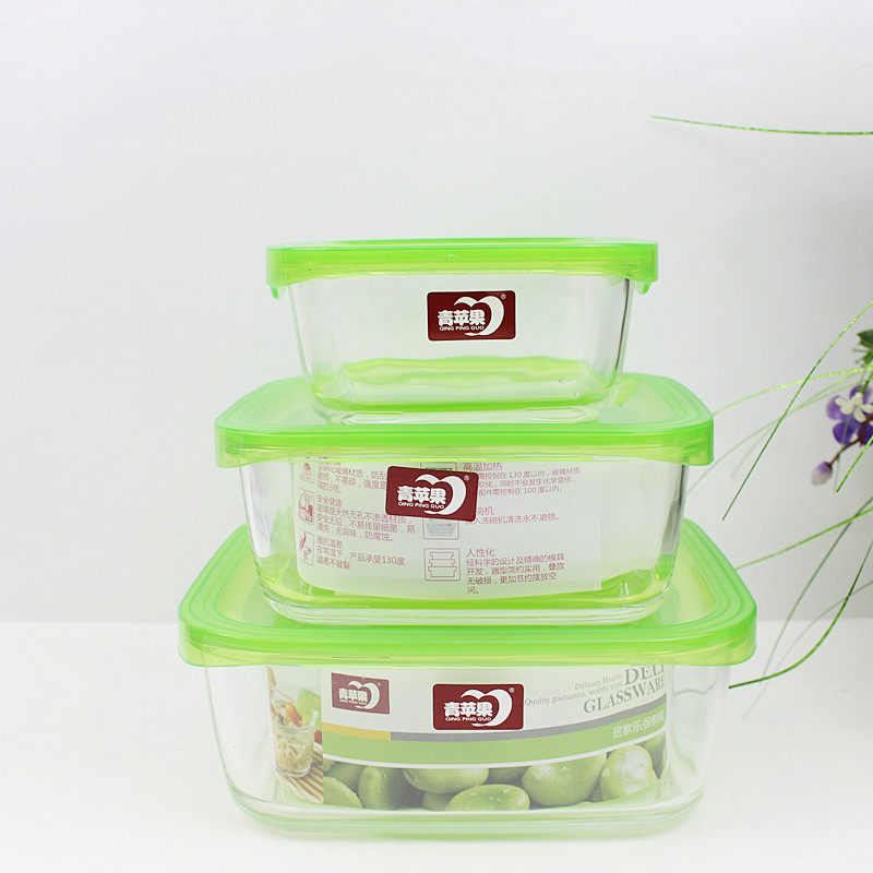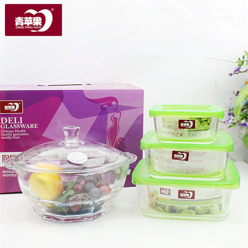 Бесплатная доставка по китаю Зеленое яблоко полностью Закаленное стекло 4 предмета 3 ящика для свежих продуктов + 1 шт стекло корпус Ланч-бокс с чашей