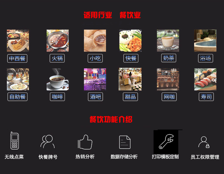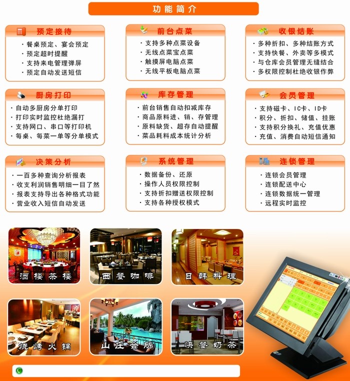 только что версия Особенности программного обеспечения для общественного питания: à la carte, кассовый аппарат, инвентарь, член, финансовое отчетность, квартира панель À la Carte, Call, SMS-уведомление, удаленная проверка, групповая цепочка и т. Д.