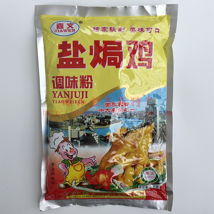 Jiawen Salt Baked Noodles - известный бренд соленой запеченной лапши в Мэйчжоу. верх Запеченная в соли курица, приготовленная с запеченным порошком из соли цзявэнь, имеет золотистый цвет, хрустящую кожу, хрустящие кости, нежное и гладкое мясо и богатый аромат.Это ингредиент для приготовления курицы, запеченной в соли хакка.
