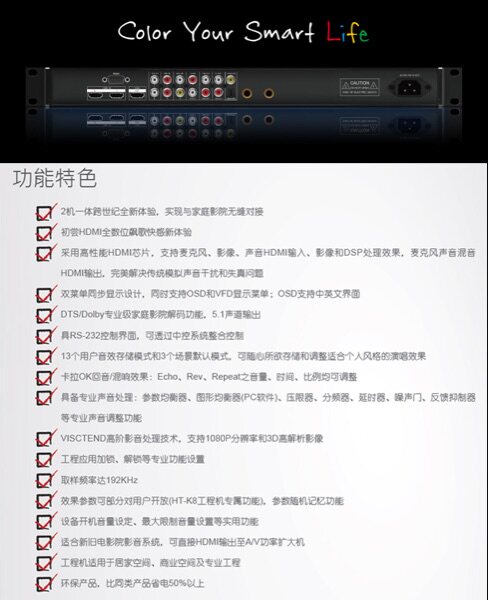 Запатентованная технология, профессиональный ревербератор HDMI, аудио частота Процессор декодирования, два входа HDMI, один выход HDMI, поддержка 1080P полностью высокая Четкий сигнал, синий Световой 3D-сигнал. Профессиональный американский ADI dual-core Процессор DSP с плавающей точкой, высокая До 400M мастер частота , 192K, 24 бит высокая Производительность АЦП / ЦАП, имеет Функция подавления обратной связи для предотвращения свиста микрофона. Схема обработки микрофона до 15-полосного параметрического эквалайзера(PEQ), Музыкальная 7-сегментная настройка параметров, полностью Посуда на телеэкране один Или компьютерное программное обеспечение можно точно настроить, и хост может его использовать в оригинальной упаковке Экран дисплея VFD с точечной матрицей и полностью Функция дистанционного управления. С участием имеет Домашний кинотеатр 5.1 полностью Формат декодируется, и сигнал микрофона можно обрабатывать, микшировать и выводить на низ Усилитель мощности домашнего кинотеатра HDMI класса 1 для реализации уже имеет Домашний театр система Петь. высокая Лучший выбор для классного домашнего кинотеатра с караоке.