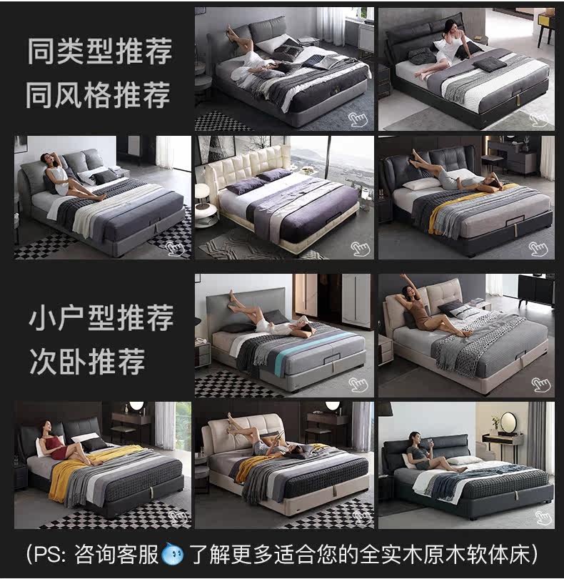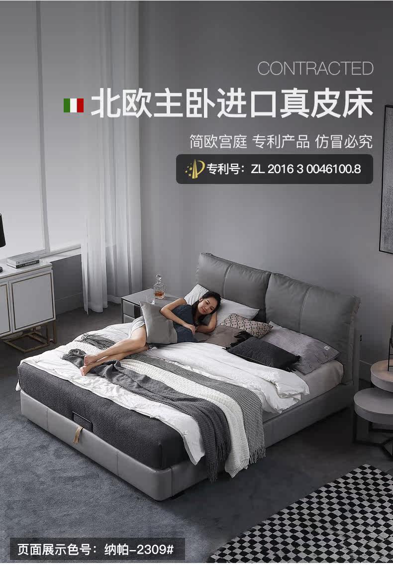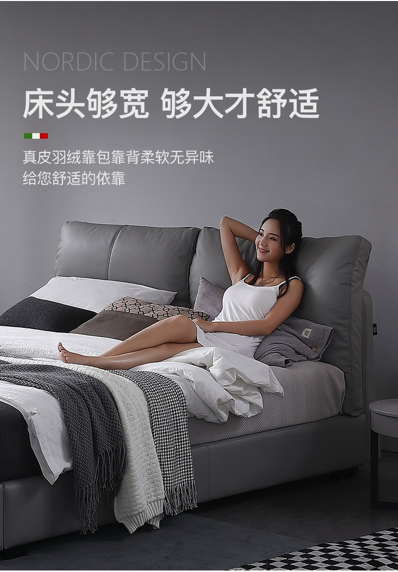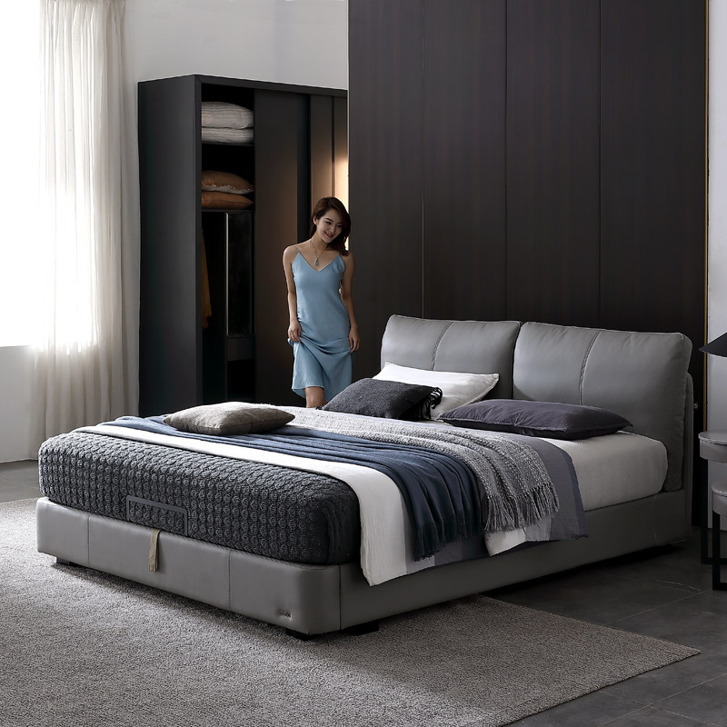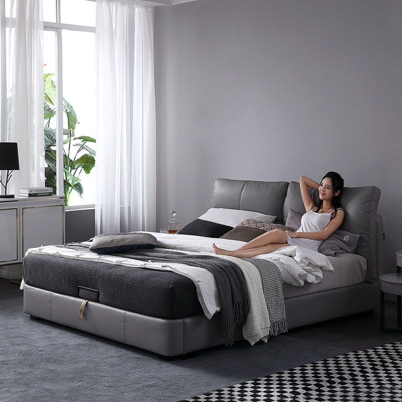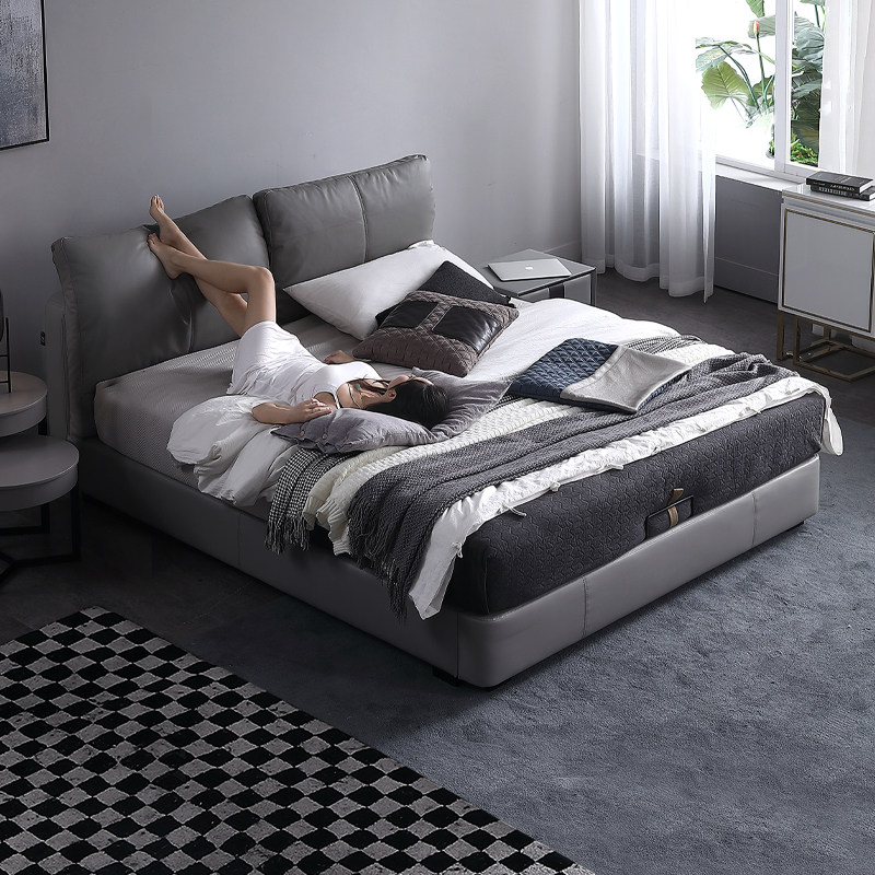 Кожаная кровать из натуральной кожи Кровать Nordic поколение Простое хранение мягкое пакет Легкая роскошная атмосфера 1.8M спальня двойная свадьба кровать