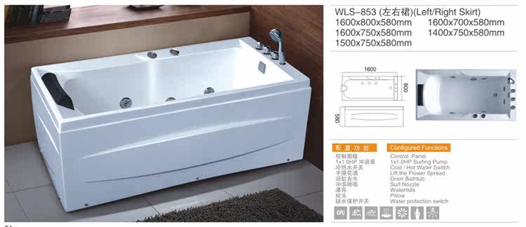 5. Массаж система : Характеристики водяного насоса: a. Принять полностью Закрытый двигатель герметичен, каплезащищен и влагонепроницаем; б. Низкая вибрация и шум; в. Мотор имеет высокую мощность, сильную струю воды и хороший массажный эффект.