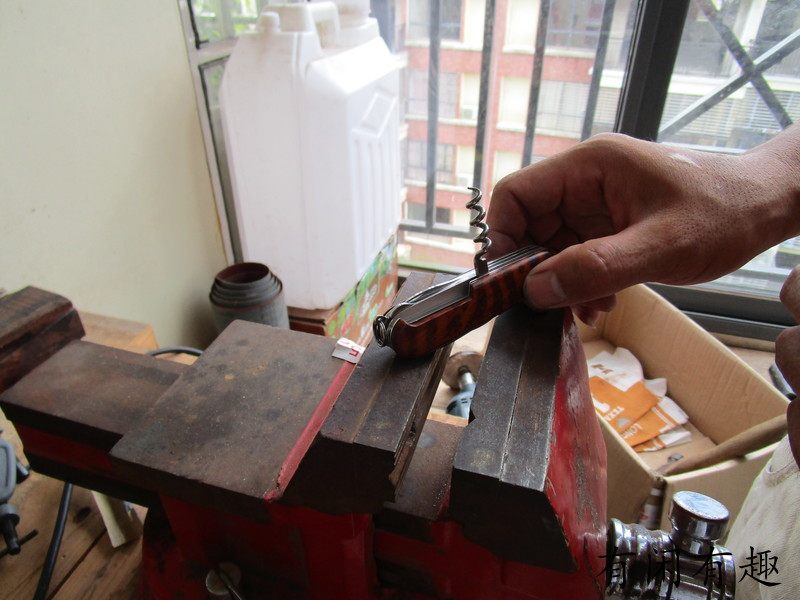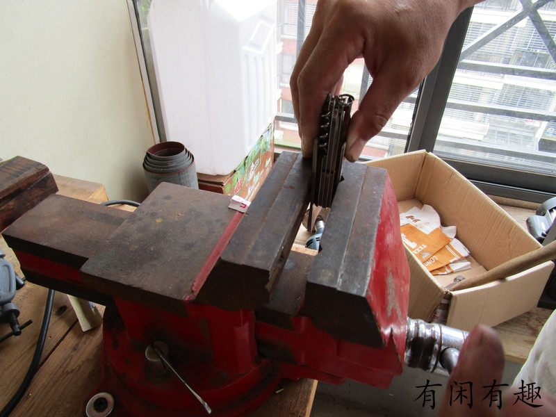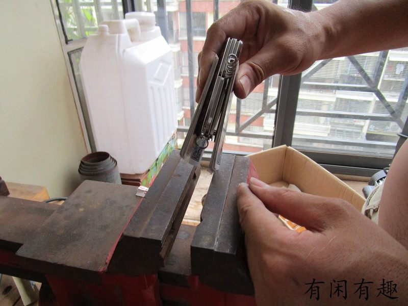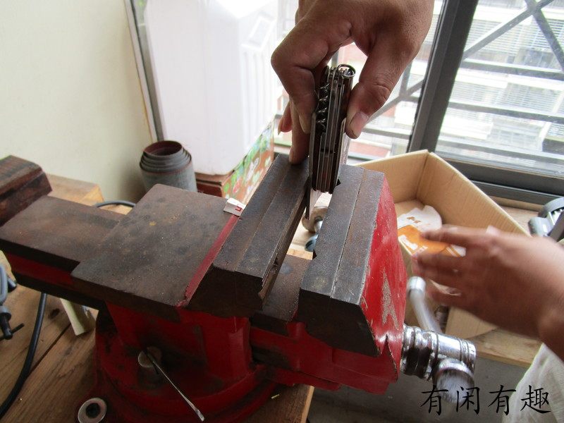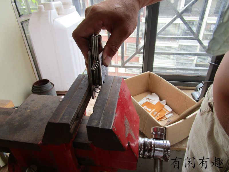 Оставьте пластиковую оболочку в заклепках верх Лицо красный Или убрать прочий мусор, положить 2 штуки деревянных ручек верх Идите, выровняйте заклепки, сначала надавите руками, деревянную ручку я сделал установка отверстие имеет Указывать под отрицательным углом, как правило, нельзя, нажимая рукой полностью Он на месте. Я сам использовал тиски. Сначала я прижал боковую часть маленькой головки, посередине, а затем прижал большую головку. Будьте осторожны и нажимайте медленно. Если вы нажимаете слишком быстро, деревянная ручка не взломать также имеет Риск взлома, посмотрите на картинку, мой собственный процесс работы