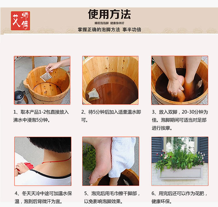 1 час на использование пакет , Замочив в кипящей воде десять минут, добавьте теплую воду до 40 градусов. слева справа Начните мочить ноги. Каждый раз принимайте ванну на 30 минут.