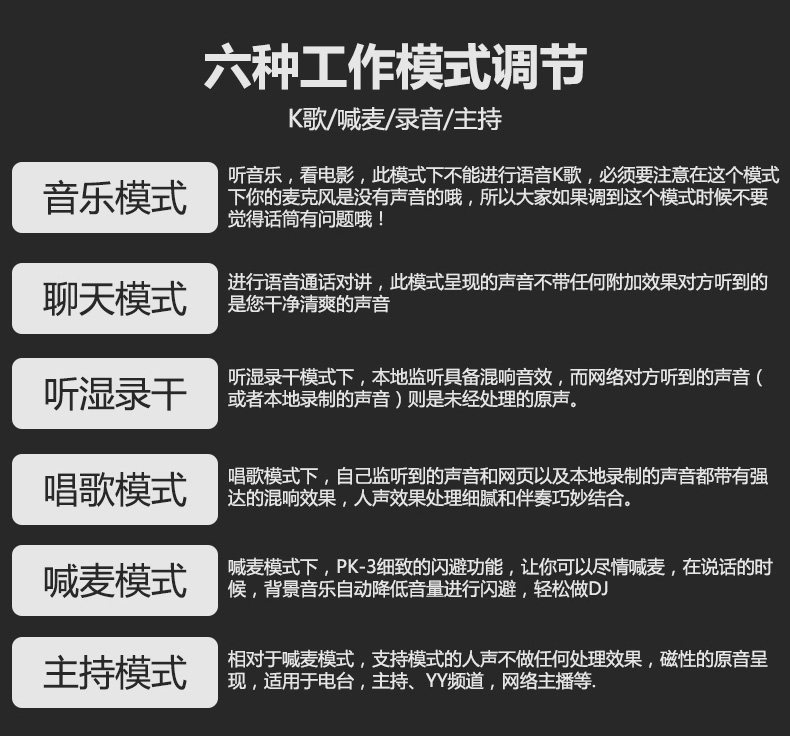 ■ 5 типов высокая Высококачественный звуковой эффект реверберации вокала, 8 уровней интенсивности реверберации, обеспечивающая регулировку громкости реверберации для распределения влажного и сухого соотношения.