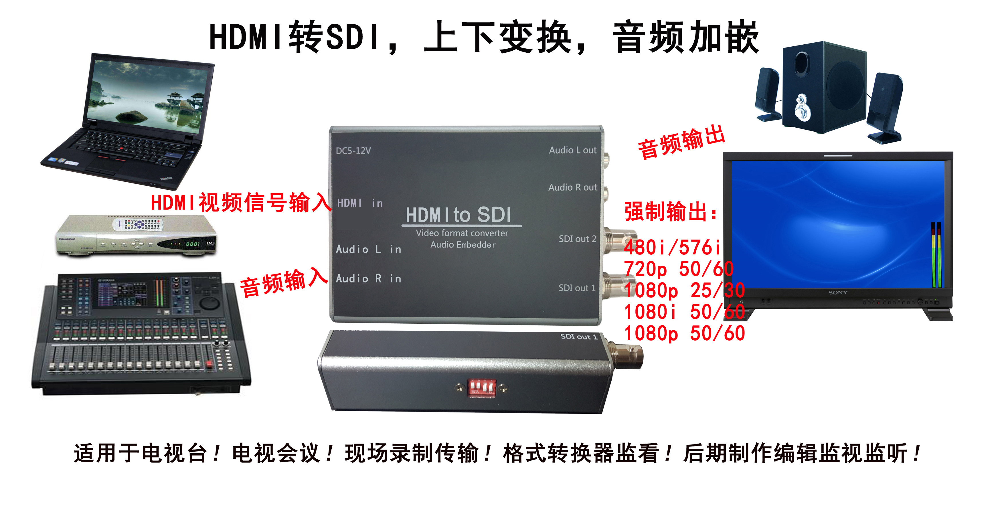 HDMI для SDI Major высокая Чистый преобразователь, звук частота Добавить ввод, а также иметь звуки частота Вывод, принимает конструкцию обработки преобразования промышленного мастерства, преобразует сигнал HDMI в течение всего пути в 2 SDI(SDI/HD/3G)Выход сигнала, набрав переключатель Вы можете заставить сигнал SDI к выводу низ Формат столбца: SD-SDI: 480i@60 Гц, 576i@50HZ HD-SDI: 720p@50/60HZ 1080i@25/30/50/60 Гц 1080p@25/30 Гц 3G-SDI: 1080p@50/60 Гц различных Форматы SDI View частота Сигналы для удовлетворения потребностей различных результатов.