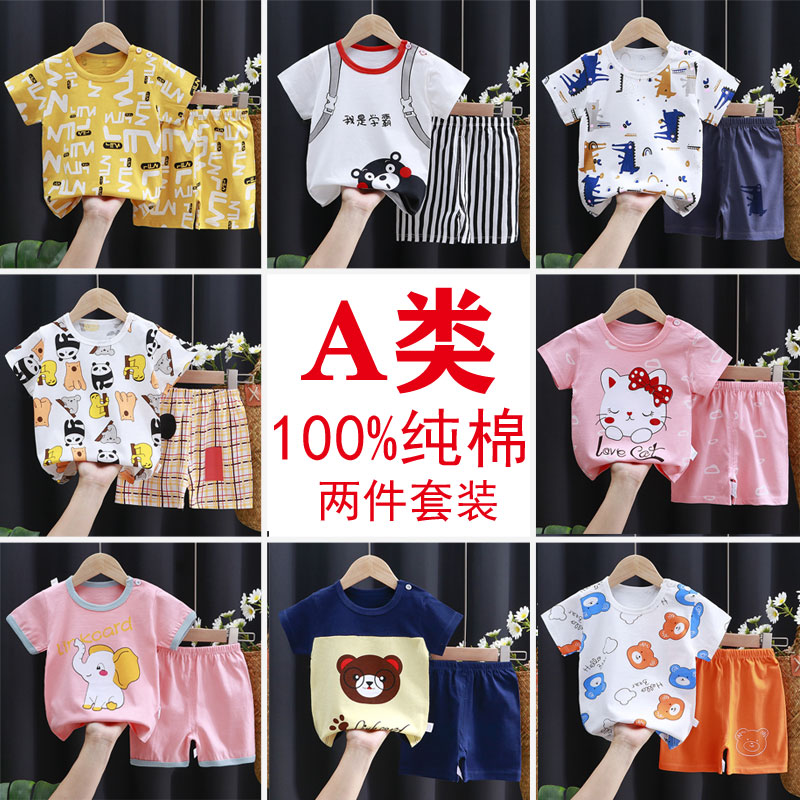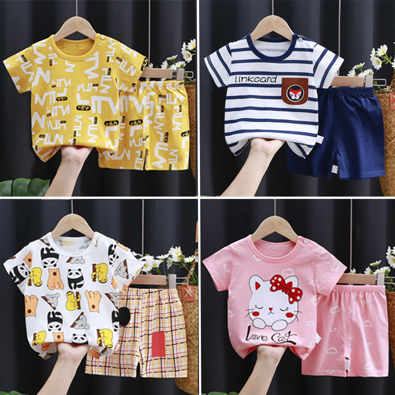 Летнее платье детские короткий рукав Футболка детские чистый хлопок комплект корейская версия мужские и женские Ребенок мультфильм футболка младенца короткий рукав два наборы
