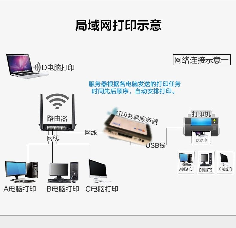 Несколько компьютеров печатают одновременно автоматическая очередь, без необходимость вручную Обрабатывать задание на печать. Поддержка экспресс электронной поверхности один принтер, стрелка Отек-принтер. Поддержка протокола TPC / IP.СвояПорт USB подключен к принтеру, и пользователи внутри локальной сети могут поделиться печатью. без Требовать дверь Откройте компьютер!