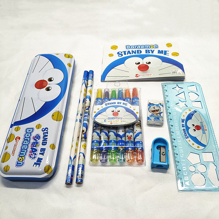 Набор канцелярских товаров: однослойный Коробка для канцелярских принадлежностей. Два карандаша. Линейка. Точилка для карандашей. Стирательная резинка. ПримечаниеКнига