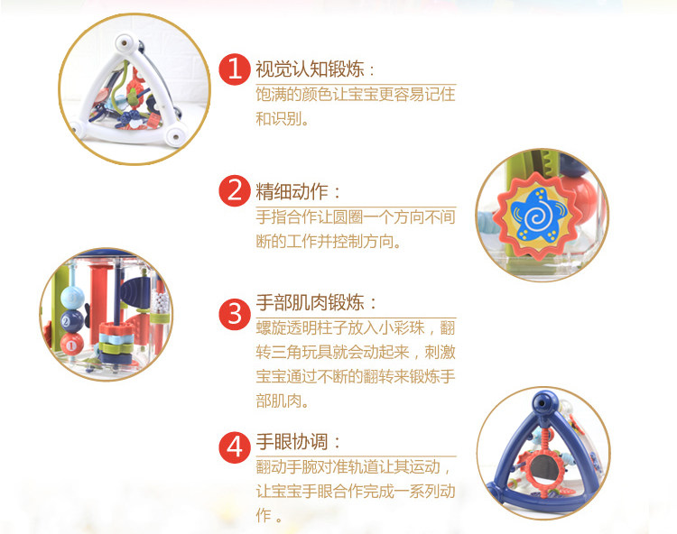 & amp; nbsp; Три оси этой игрушки наполнены пластиковыми шариками размером с маш, которые шуршат при движении. Его пять сторон в основном предназначены для отработки навыков работы с пальцами, из которых верх и низ Функции с обеих сторон повторяются, обе мелочи наборы Подвешивание на изогнутой пластиковой опоре верх , Вам нужно использовать мизинец, чтобы переместить их.