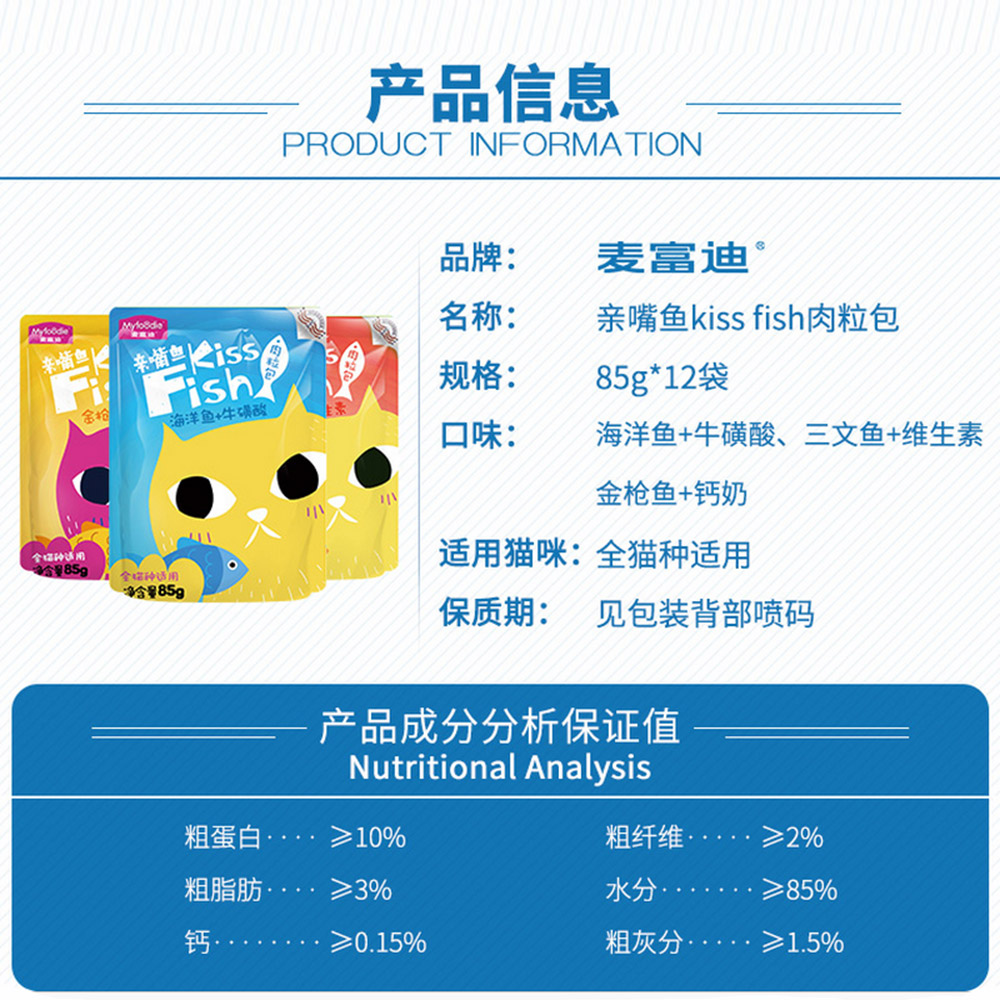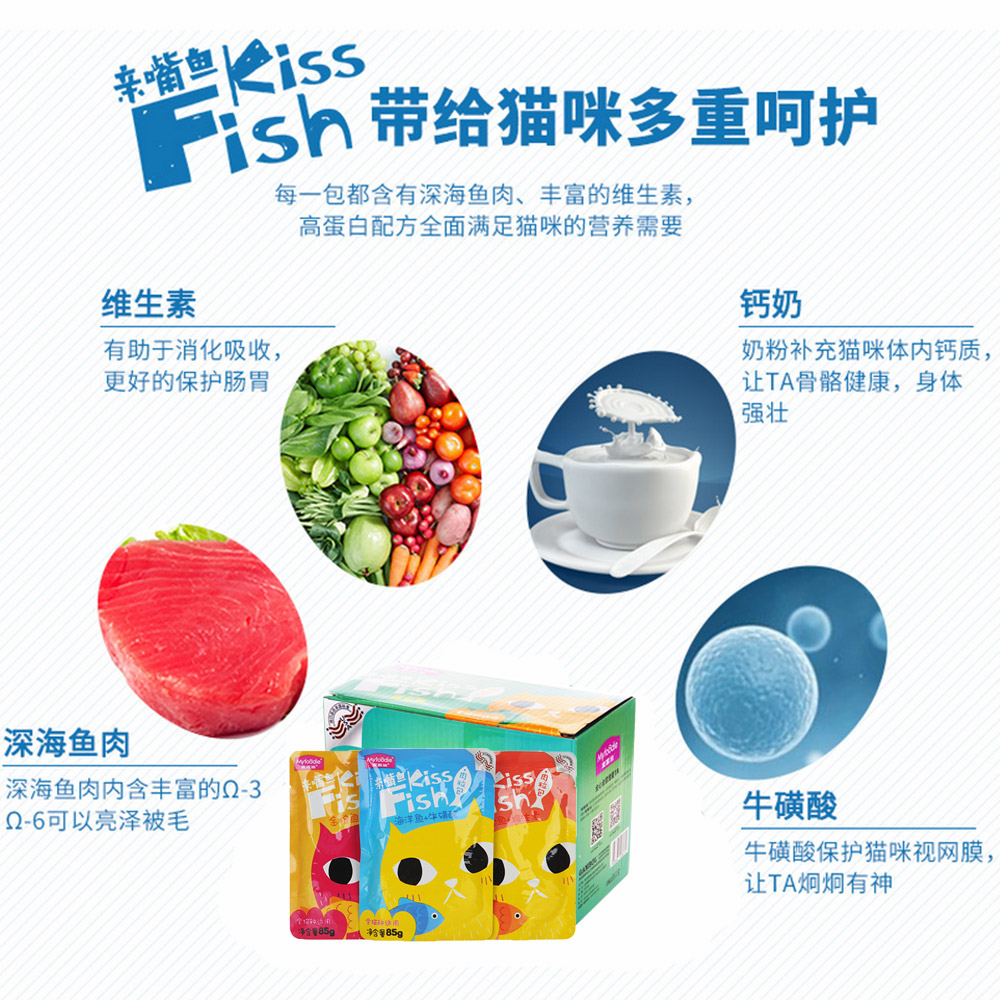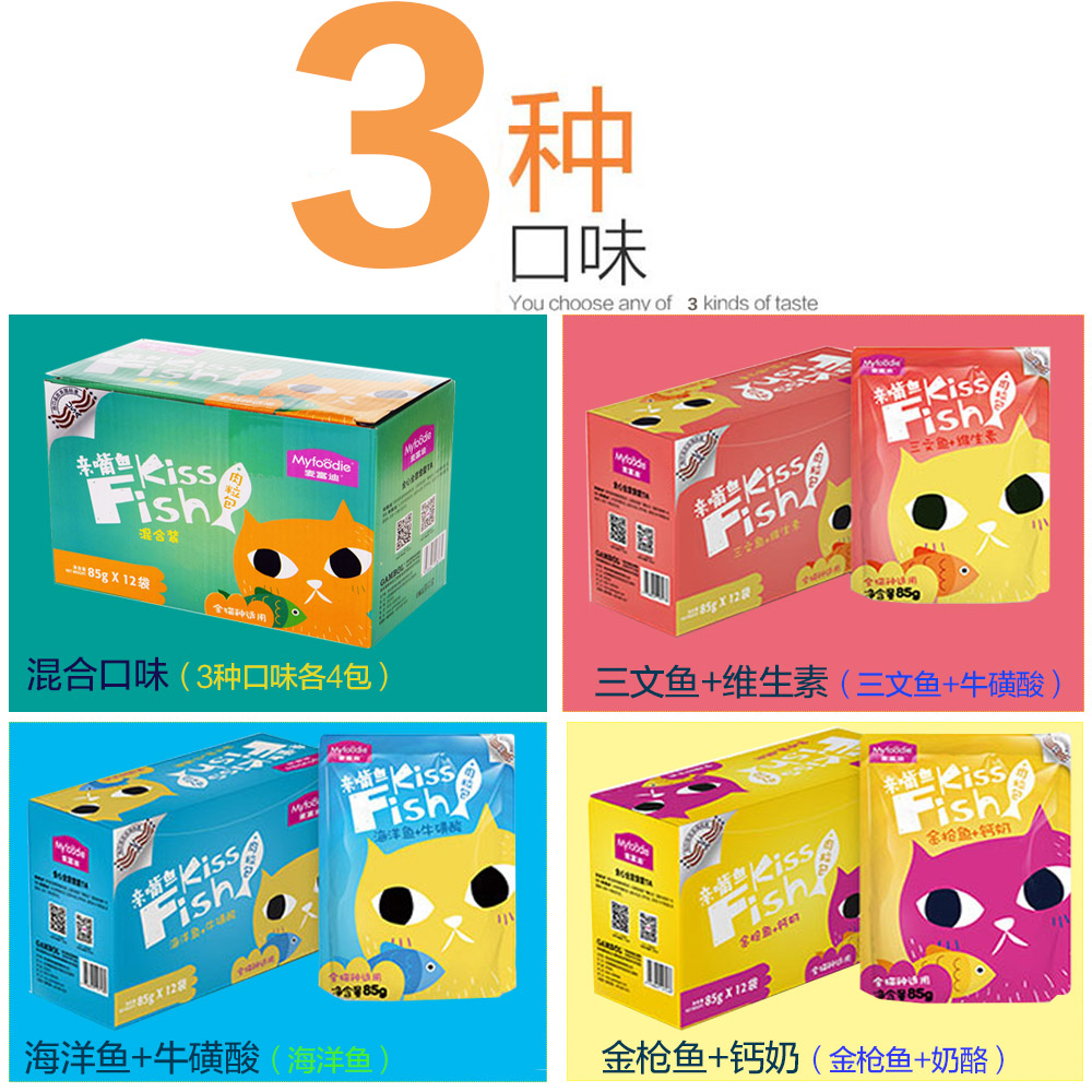 【название】:McFudi Kiss Fish Fished Rothing вкусы кошачьего мяса пакет 85G*12(Смешанный вкус)/McFudi Kiss Fish Tuna+кальциевое молоко кошачье мясо пакет 85G*12(Золотой тунец+сыр)/McFudi Kiss Fish Salmon+витаминовое мясо кота пакет 85G*12(Лосось+таурин)/McFudi Kiss Fish Marine Fish+Taurine Cat Meat пакет 85G*12(Морская рыба)