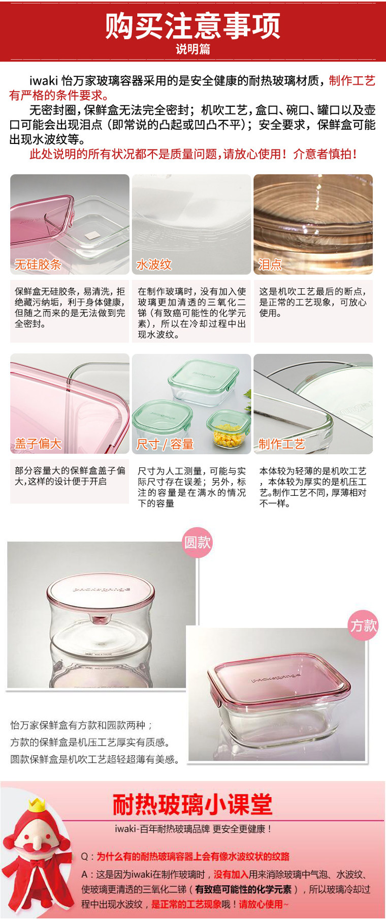 \ \3. Круглый контейнер для свежих продуктов изготовлен машинным способом. Случайные пятна на стекле по краю рта - нормальное явление. Это не проблема качества и не влияет на использование.