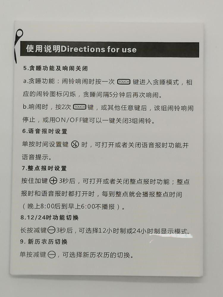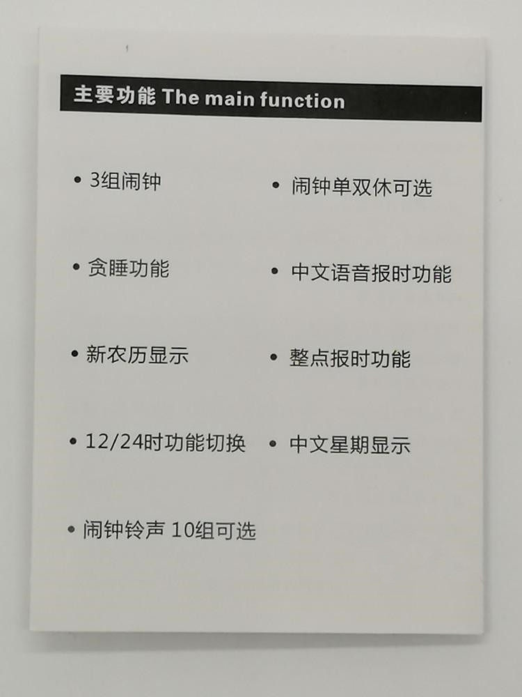 Отображение времени; отображение даты; недельный дисплей; голосовой отчет; три набора тревоги; музыкальный сигнал тревоги; свет Рабочий день переключатель.