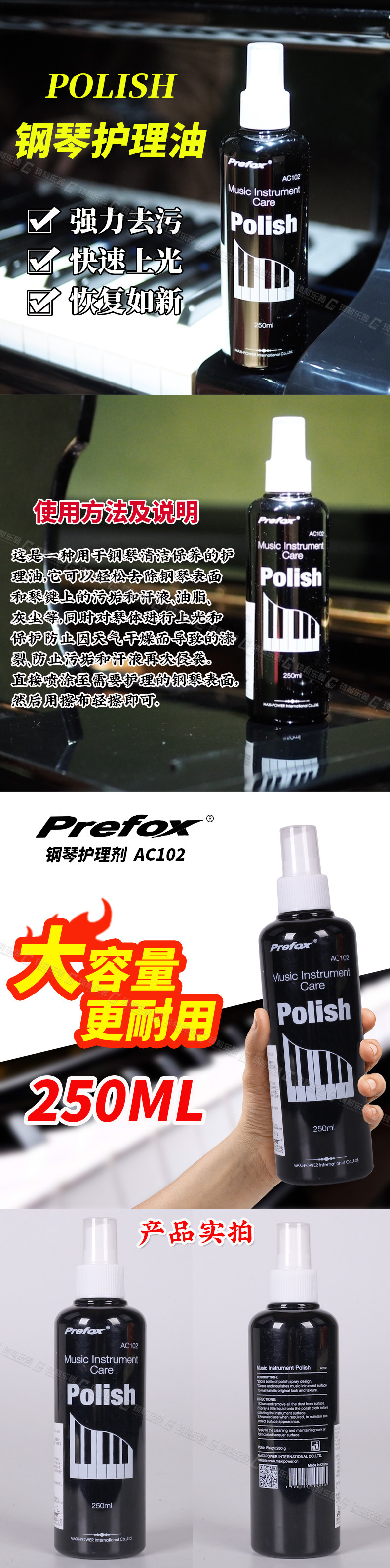 Prefox Piano Cleaner Большая бутылка Электронная гитара клавиатуры Яркая воска для ухода за полировкой для полировки
