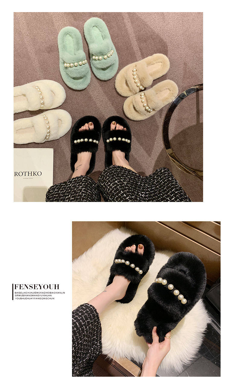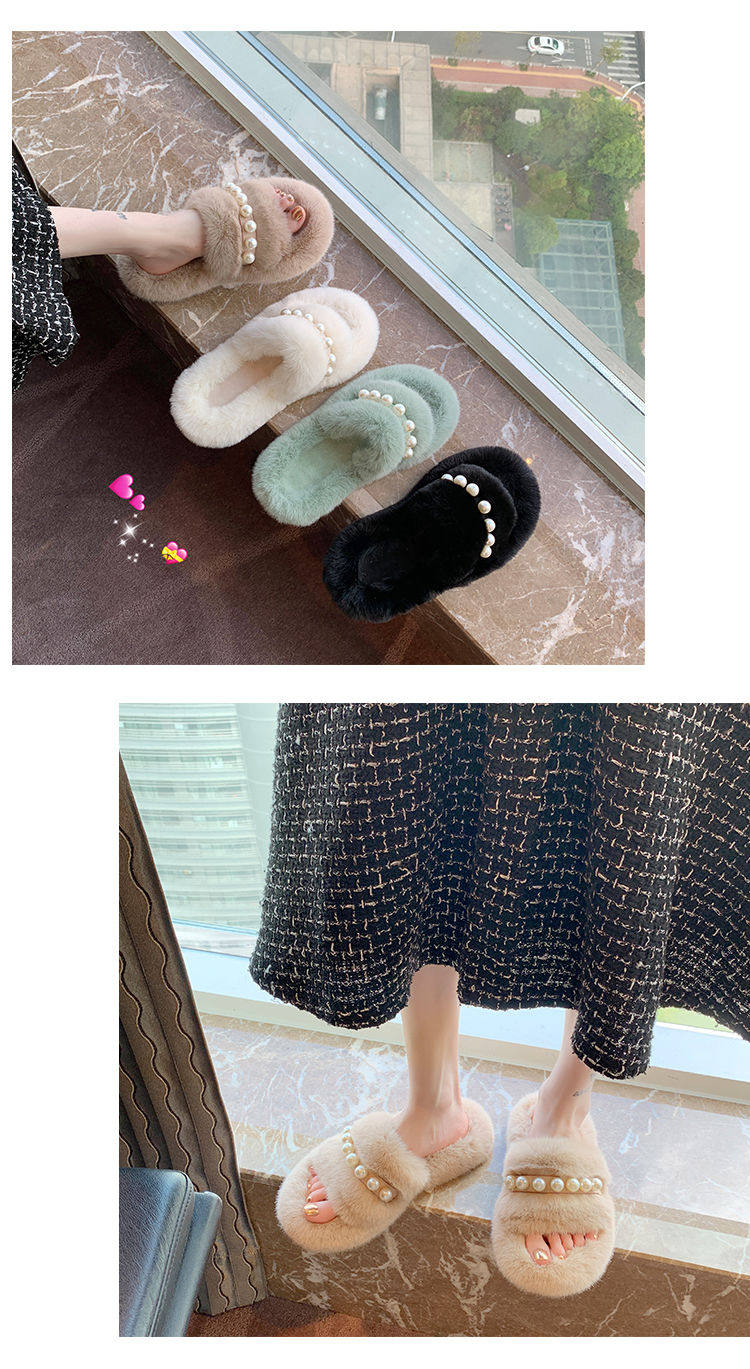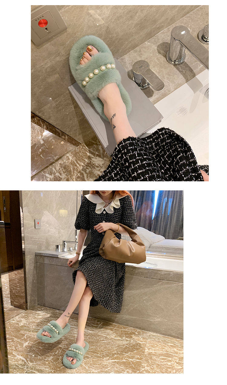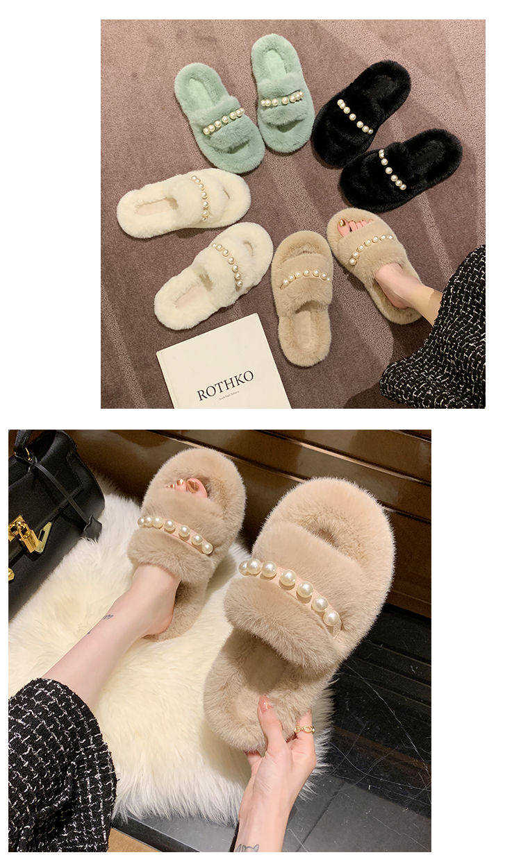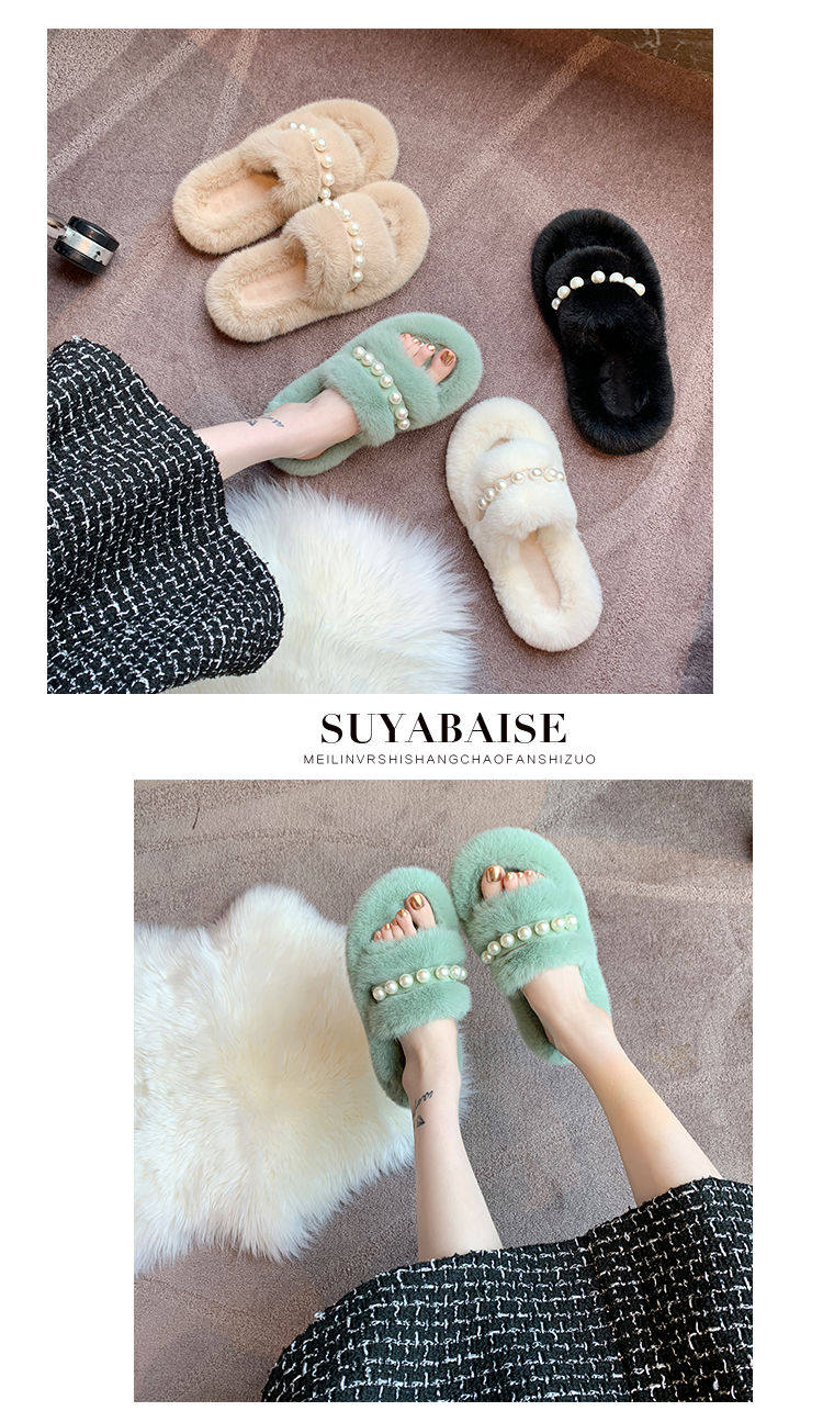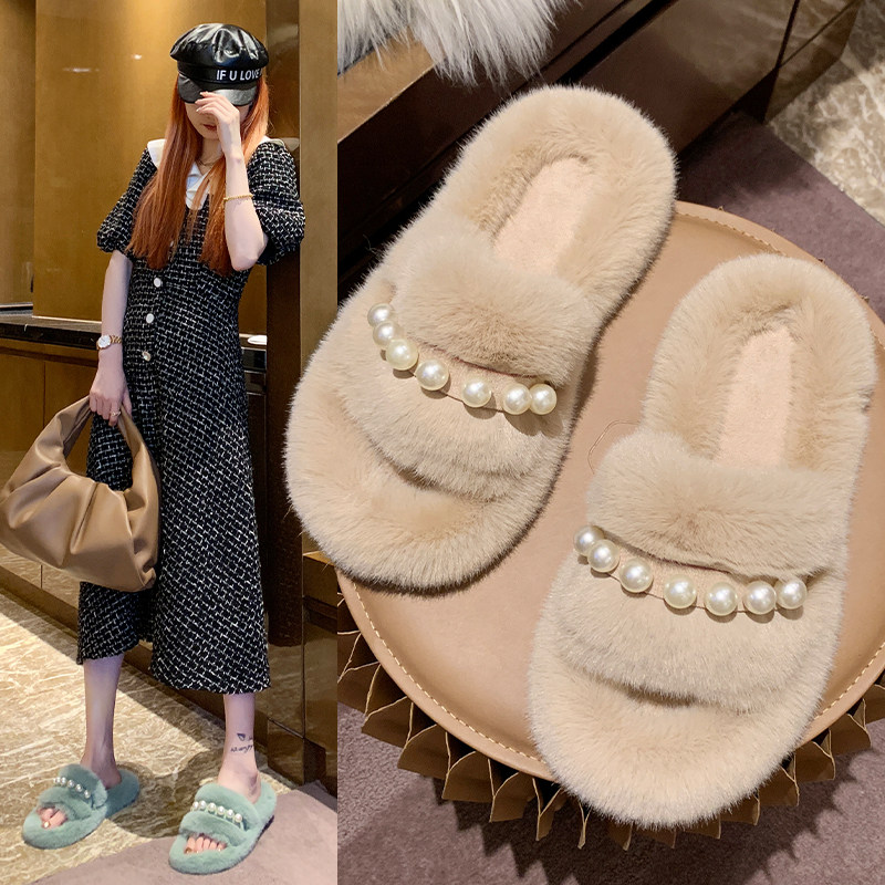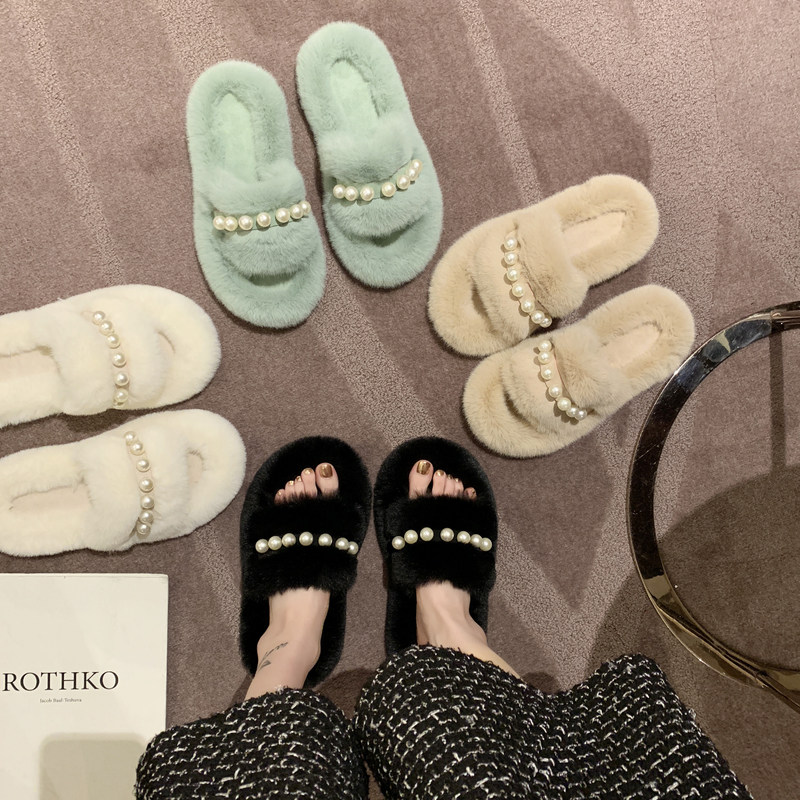 Мех тапки 2020 осень-зима новая коллекция с жемчужинами Мех тапки на плоской подошве замшевый удерживающий тепло хлопок тащить тапки Женщины Ins