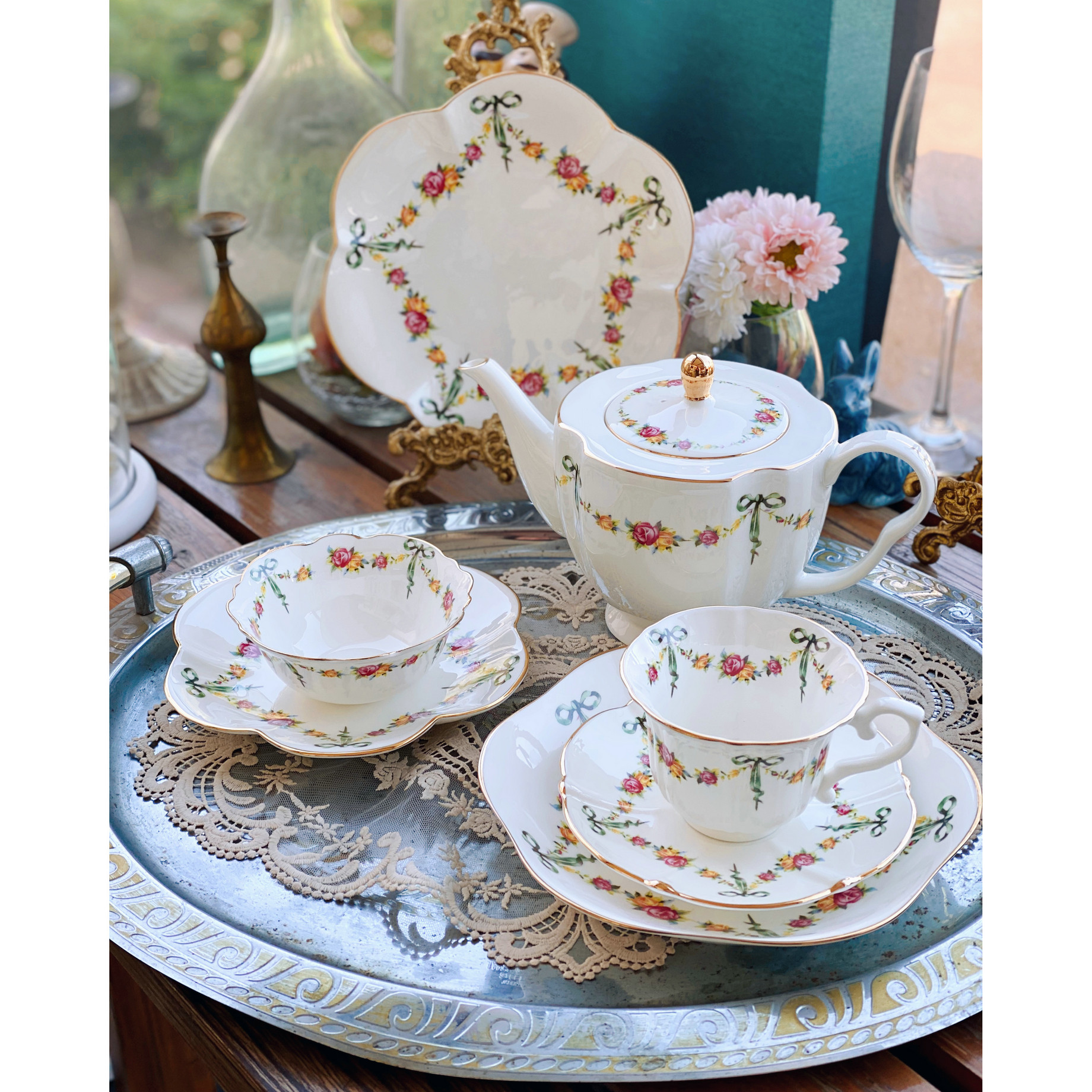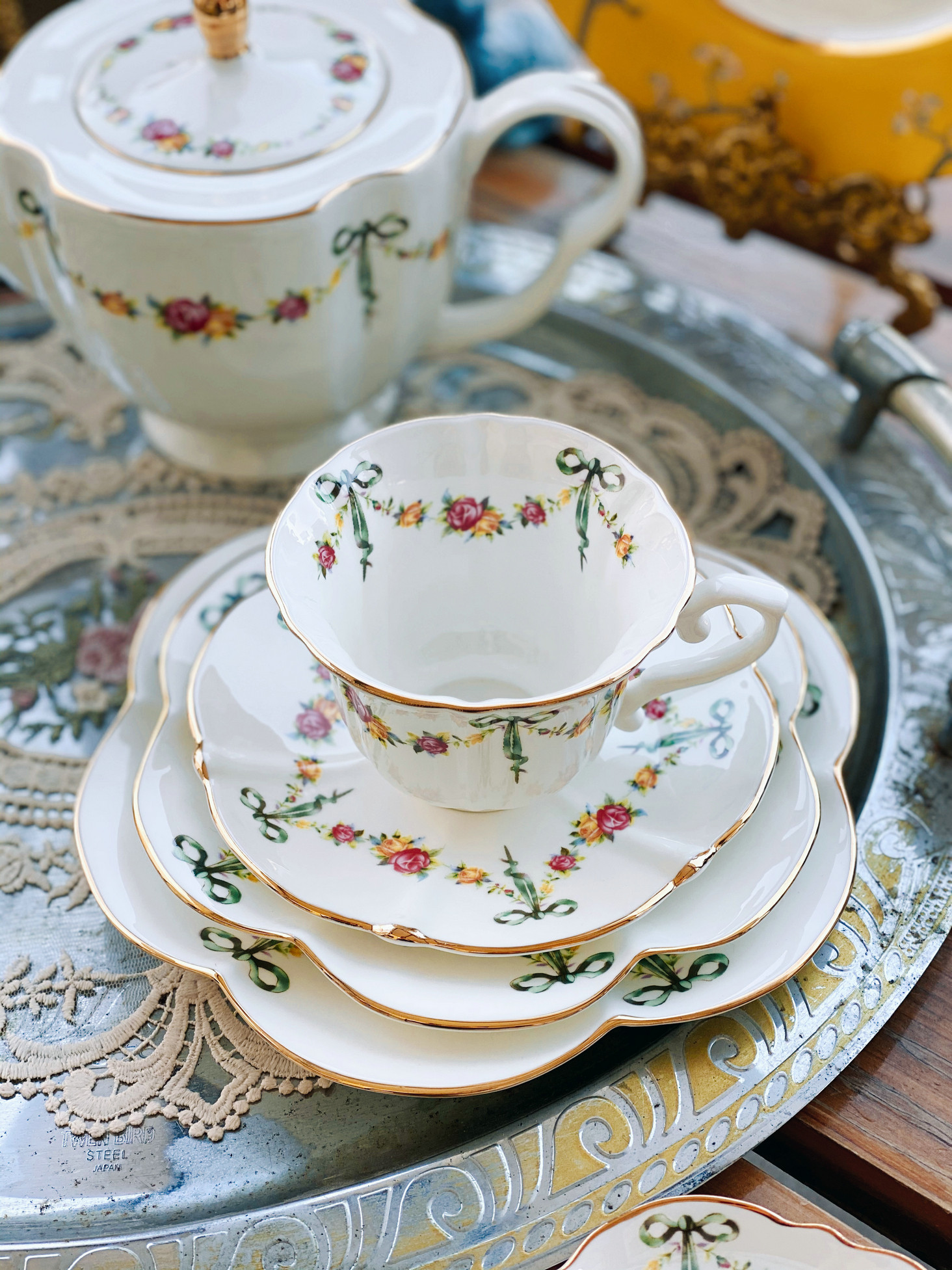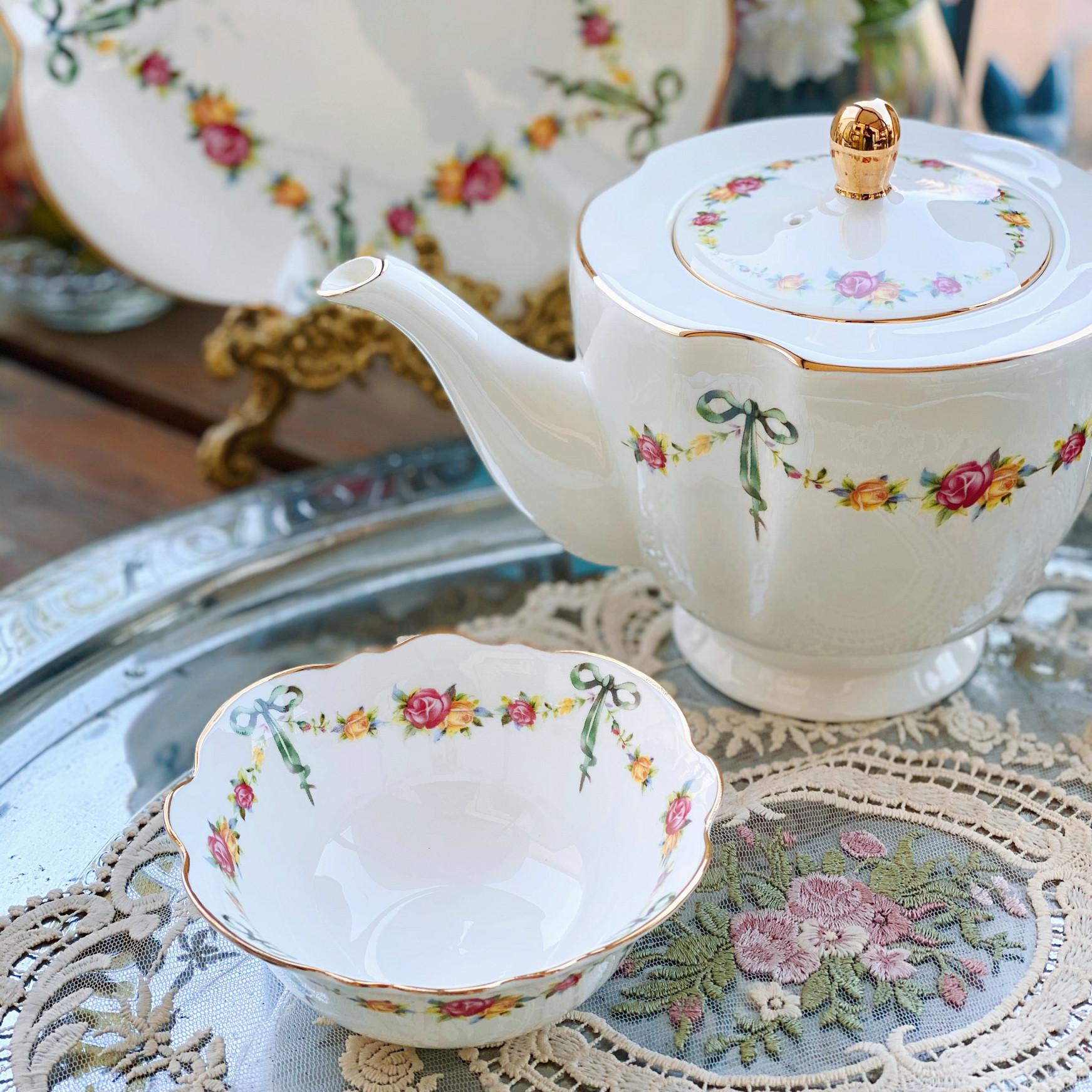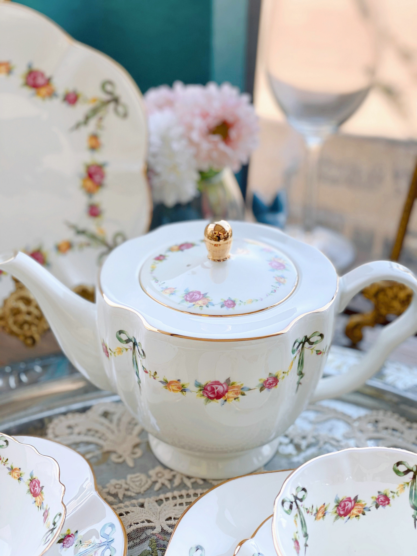 «Лента роза» выходная фарфоровая фарфоровая фарфоровая чаша кафе Cafe Cufe Cup Cup Teapot низ Обеденный чай комплект butterfly