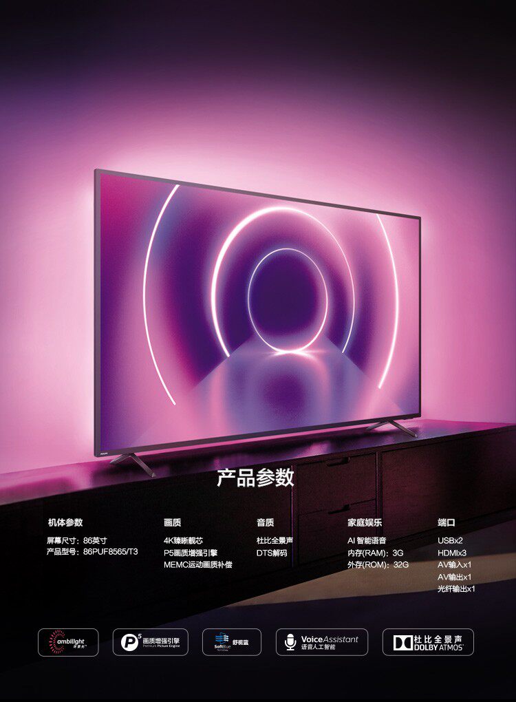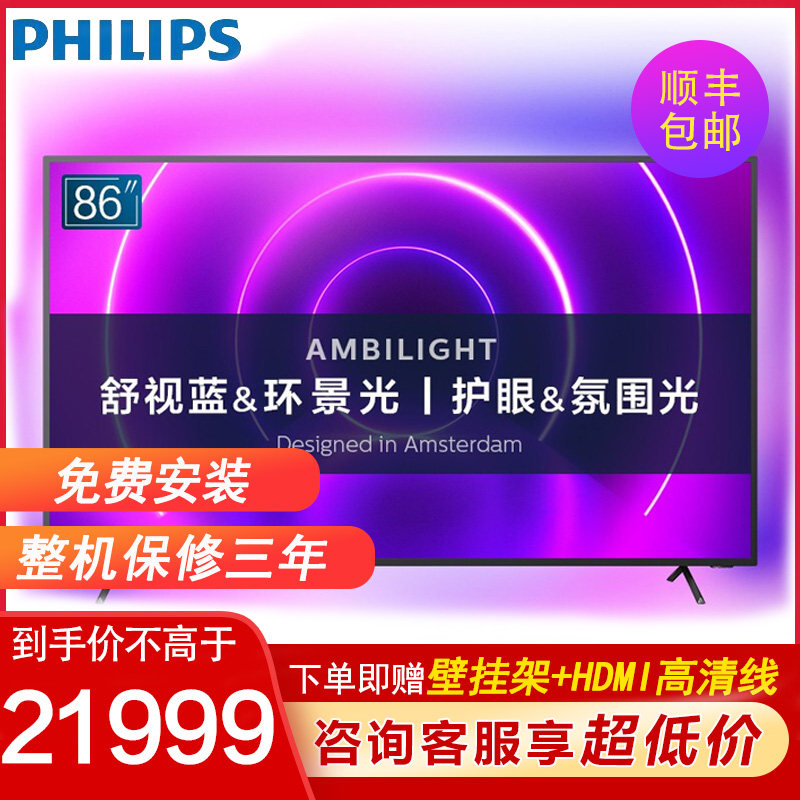 86-дюймовый комфорт Philips синий Защита глаз 4K Ultra Clear Surround View Light Network Smart LCD TV 86 кожзаменитель F8565