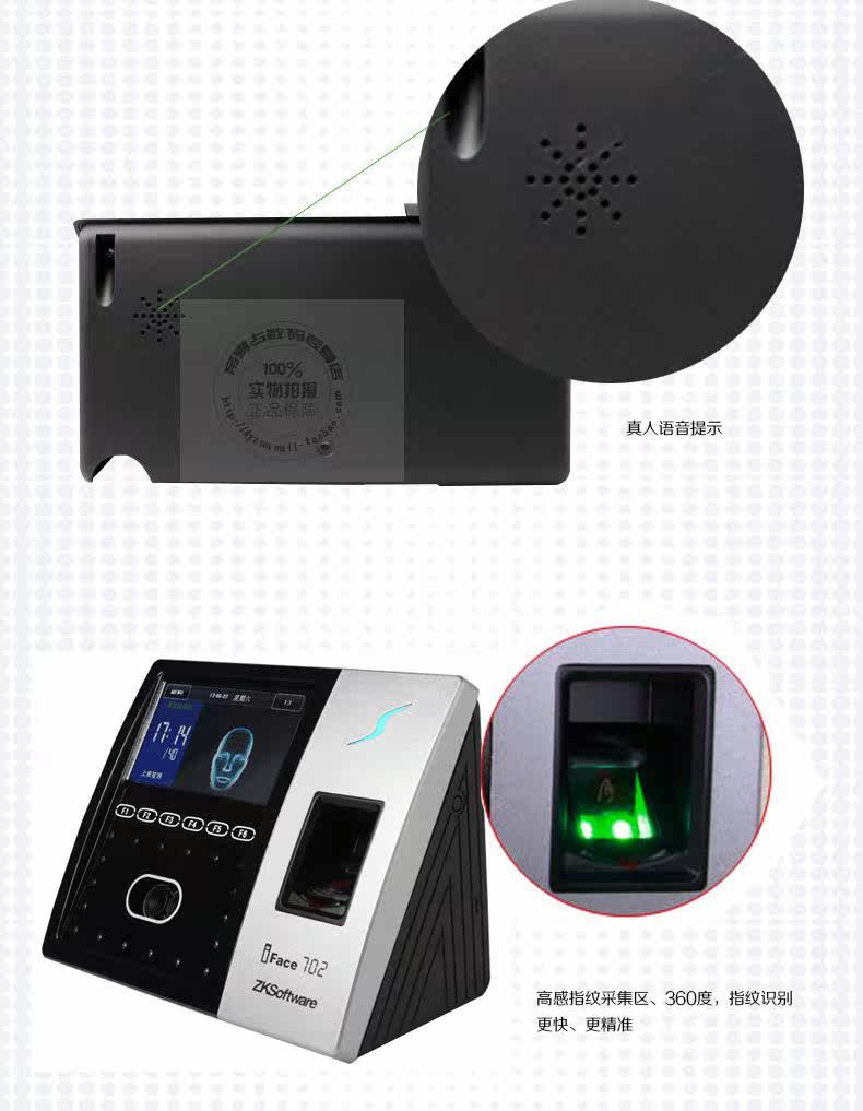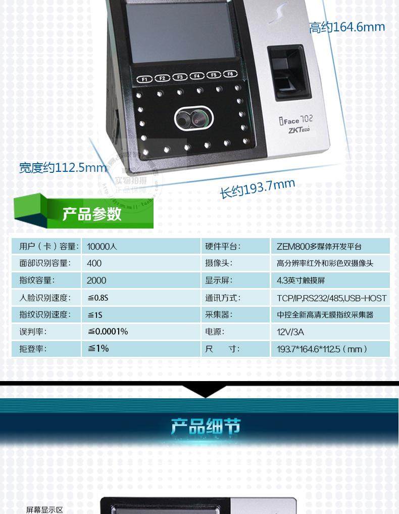 ■процессор:Multi-Bio 600 ■Аппаратная платформа:ZEM600Платформа мультимедийной разработки■камера : высокая ясно красный внешний камера■Экран монитора:4.3Дюймовый сенсорный экран■Способность распознавания лиц:400Лицо■тип карты:IDкарта ■Емкость карты:10000Чжан■Емкость записи:100000полосатый■Резервная батарея:2000mAh■способ связи:TCP/IP, RS232/485,USB-HOST:ДваUSB-hostинтерфейс■Функция посещаемости: внешний таймер, летнее время, запись запроса, работа поколение Код, короткое сообщение■дверь Запрещенная функция: стандартный Оснащен один дверь Запрещенная функция( дверь Магнитный, блокировка управления, выход дверь переключатель ,WiegandВыход), По желаниюпрофессия дверь Запрещенная функция■Другие дополнительные функции:GPRS,Серийная печать,Mifareкарта,HIDкарта,iClassКарта и т. Д.■источник питания:12V 3AiFace702Технические параметры(это стиль Назначение принт Используйте, обратите внимание на разницу) ■процессор:Multi-Bio 600 ■Аппаратная платформа:ZEM600Платформа мультимедийной разработки ■камера : высокая ясно красный внешний камера ■Экран монитора:4.3Дюймовый сенсорный экран ■Способность распознавания лиц:400Лицо ■Средства принт вместимость:2000 ■Емкость записи:100000полосатый ■Резервная батарея:2000mAh ■способ связи:TCP/IP, RS232/485,USB-HOST:ДваUSB-HOSTинтерфейс ■Функция посещаемости: внешний таймер, летнее время, запись запроса, работа поколение Код, короткое сообщение ■дверь Запрещенная функция: стандартный Оснащен один дверь Запрещенная функция( дверь Магнитный, выход дверь переключатель , Контроль блокировки,WiegandВыход), Дополнительный специальныйпромышленность дверь Запрещенная функция ■Другие дополнительные функции:GPRS,Серийная печать,Mifareкарта,HIDкарта,iClassКарта и т. Д. ■источник питания:12V 3A