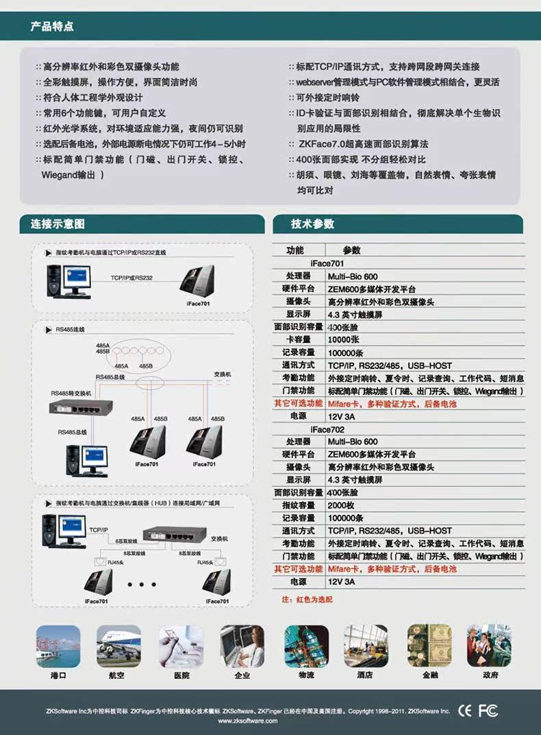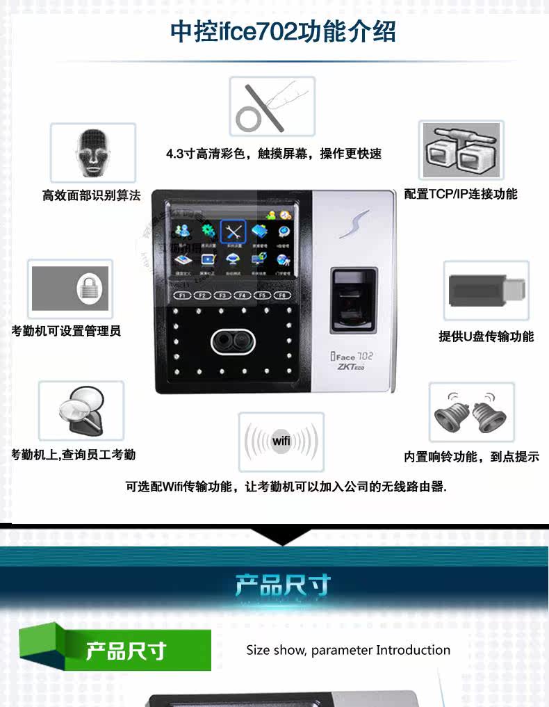 iFace701/702Supcon Technology продолжаетсяIFACE301/302,IFACE501/502После2010год8Два запущенных в месяц стиль Средства принт+Лицо, лицо+RFIDГибридная посещаемость. Этот продукт принимаетZEM600Платформа,ZKFinger10.0Гибридный биометрический алгоритм, большая емкость, точное и быстрое распознавание, встроенное ночное видение красный Внешняя оптика камера . Эта серия продуктов соответствует эргономичному дизайну,Форма используетPCматериал+затмение принт Ремесло+зеркало Надводный корабль,Сбор и сравнение похожи на фотографии зеркало Подобщий, стандартный Матч4.3Дюймы полностью трогатьTFT,TCP/IPкоммуникация,WIFIбез Только линейная связь имеет8Государственные функциональные клавиши, другие кнопка вTFTверх полностью трогатьоперационная. Эта серия продуктовПо желаниюВнешний таймер, резервная батарея,GPRSИ другие функции. внутренний Конструкция с резервной батареей может обеспечить длительную работу при отключенном питании и непрерывную работу.4 часа.