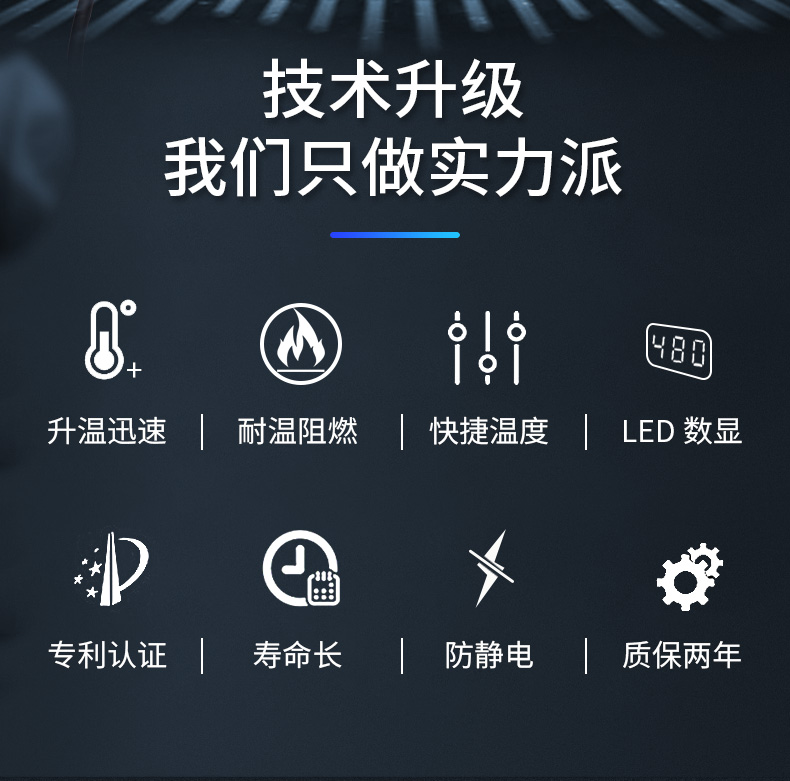 1. Принятие подлинного и надежного импортного нагревательного сердечника, его фактическая мощность больше, чем у аналогичных продуктов на рынке, точный светодиодный дисплей, быстрый нагрев, длительный срок службы.